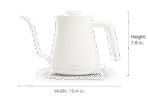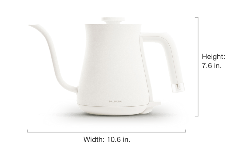 Easy to use and light to handle. BALMUDA The Kettle is the perfect size for common kitchen needs. It holds just enough water for three standard cups of coffee — or two large mugs. Available in classic white and black colors for a minimal and sleek addition to your space.